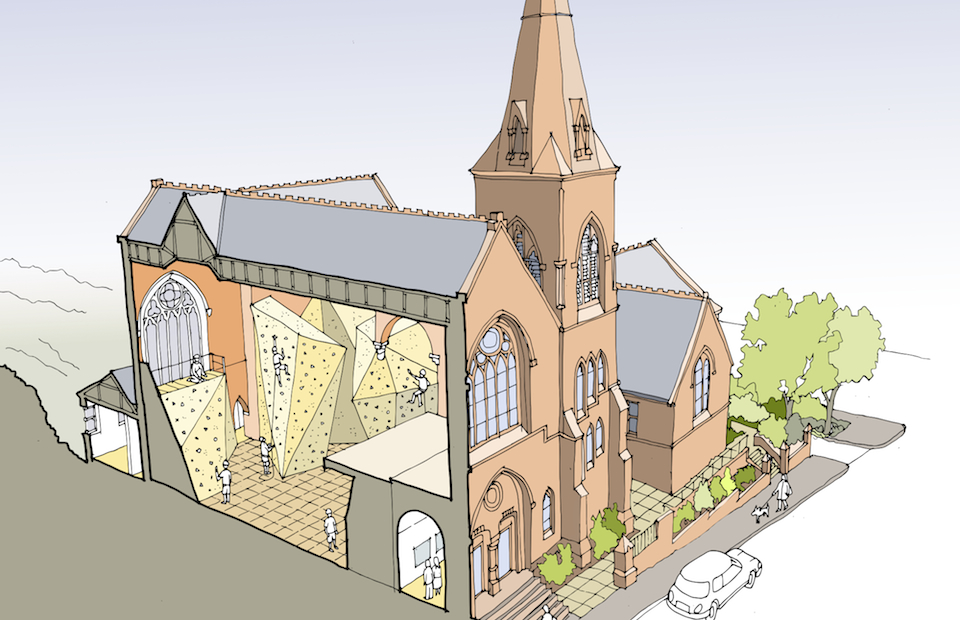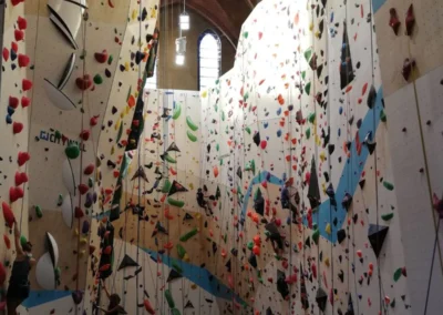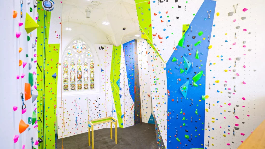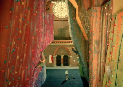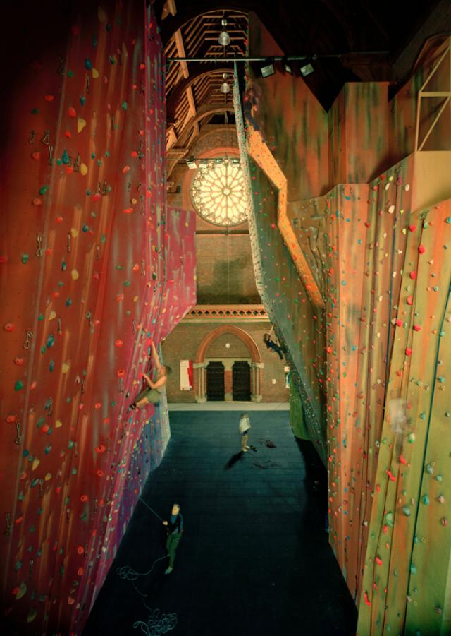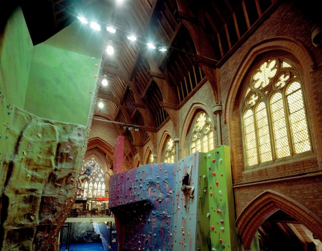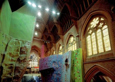 The Grade II*-listed former St Benedict’s Church in Ardwick, Manchester, was transformed into a large-scale indoor climbing facility, initially opening as the Manchester Climbing Centre in 2005. Under alterations by Buttress Fullmer Alsop Williams, steel-framed climbing walls were installed in the nave, a mezzanine was added in the chancel for a café, shop and “bouldering cave”, and services including toilets and community rooms were placed in the vestry and lady chapel.  The conversion preserved the building’s dramatic nave volume and key architectural features, giving the redundant church a vibrant recreational new use.