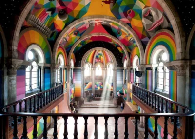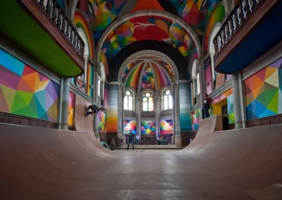 The 1912 neo-Gothic Church of Santa Bárbara in Llanera, Asturias, Spain, was abandoned for decades before local skateboarders and artists stepped in to give it a radically new lease of life. Led by the collective “The Church Brigade” and with financial backing from crowdfunding and Red Bull, the once­nave became a skate park known as “Kaos Temple,” featuring a full half-pipe and dramatic interior art by street-artist Okuda San Miguel covering walls, ceilings and arches with vibrant geometric murals. The project retains the church’s monumental space and stained-glass light, while transforming it into a hub for recreation and culture.