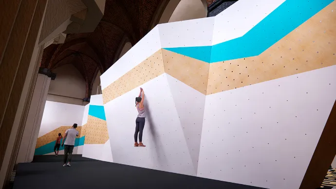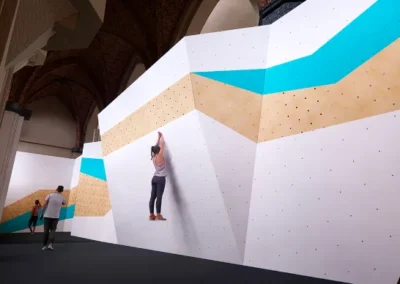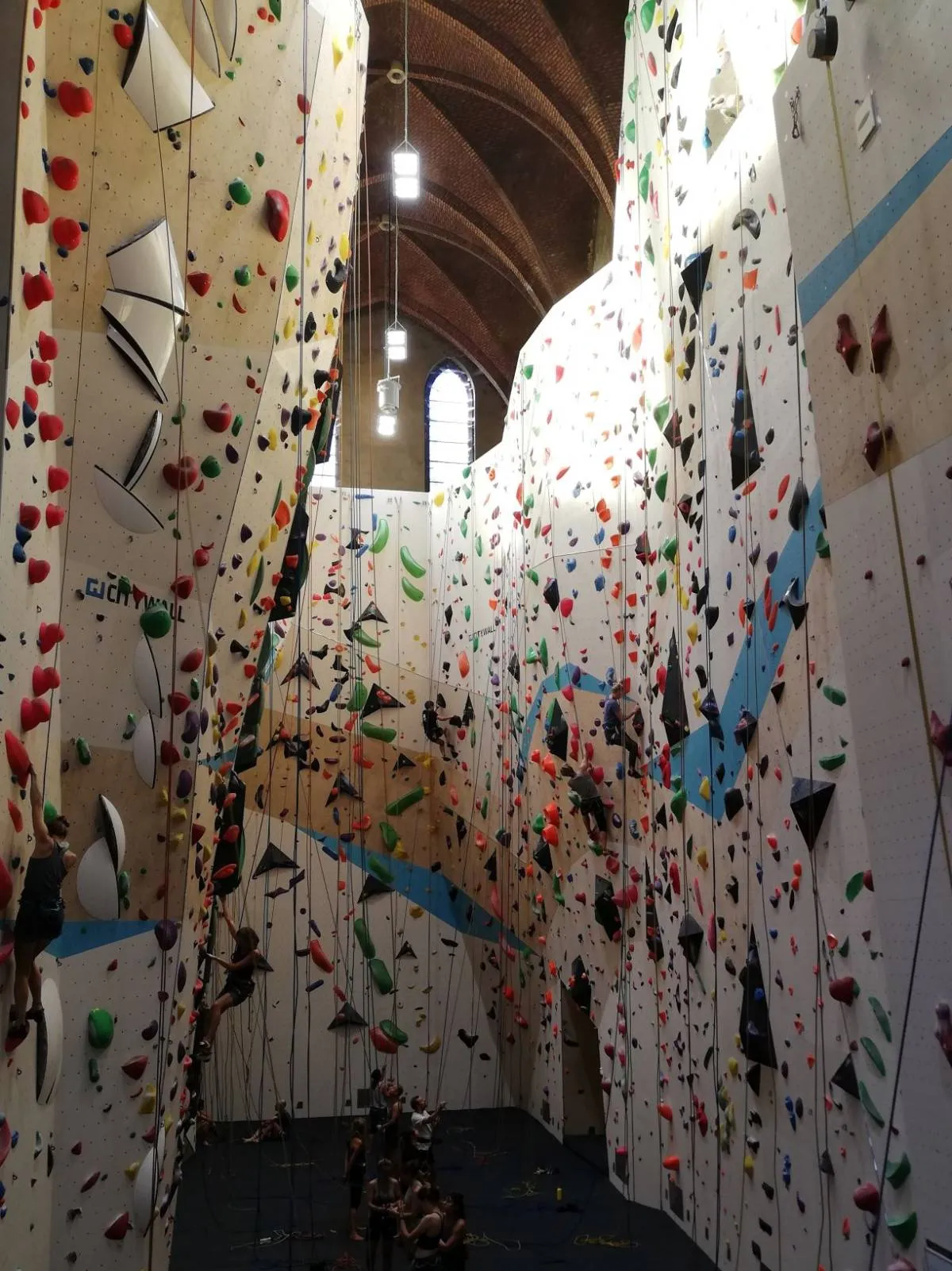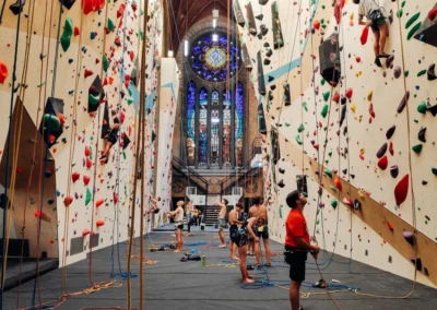 The neo-Gothic Saint Anthony of Padua Church (1905, by Edmond Serneels and Georges Cochaux) in Brussels has been creatively transformed into Maniak Padoue, a large indoor climbing centre. Under a 30-year agreement with the church authorities, the rear of the church was adapted for climbing while the front nave continues as an active worship space. Designed by architects Emmanuel Ramirez-Mauroy and Julien Barattucci, the 2023 conversion added 7,800 kg of structural steel, roof repairs, and over 1,400 m² of climbing surfaces rising to 18.5 m. The project introduced roped climbing, bouldering, speed walls and social areas beneath the preserved vaults and stained glass, giving the historic church a new recreational life alongside its religious function.