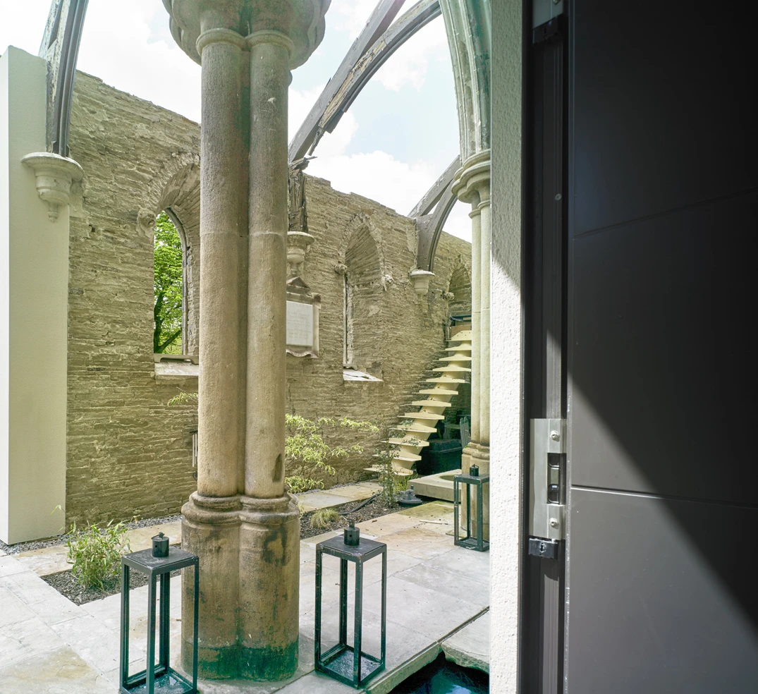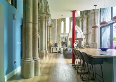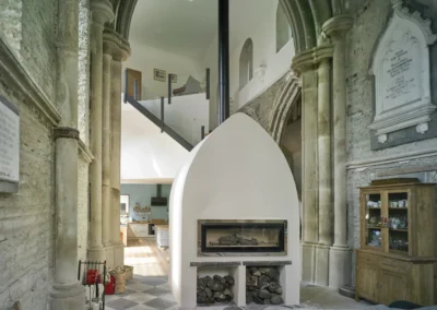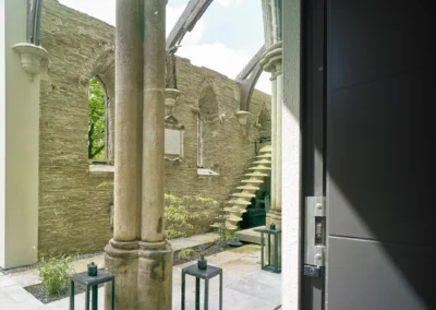 St Paul’s in Denholme, a Grade II listed mid-19th-century church, was reimagined as a singular private home by Hawdon Russell Architects. To create privacy and outdoor amenity on a site encircled by a still-visited churchyard, the architects removed the roof over the south aisle to form a landscaped courtyard, adding a water feature inspired by the baptismal font and a small bridge across a carp pool to the front door. Internally, the historic volume and fabric were retained wherever possible while contemporary living spaces were inserted with a light touch—an approach that turned a deteriorating landmark into a distinctive dwelling without erasing its ecclesiastical character.