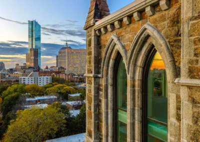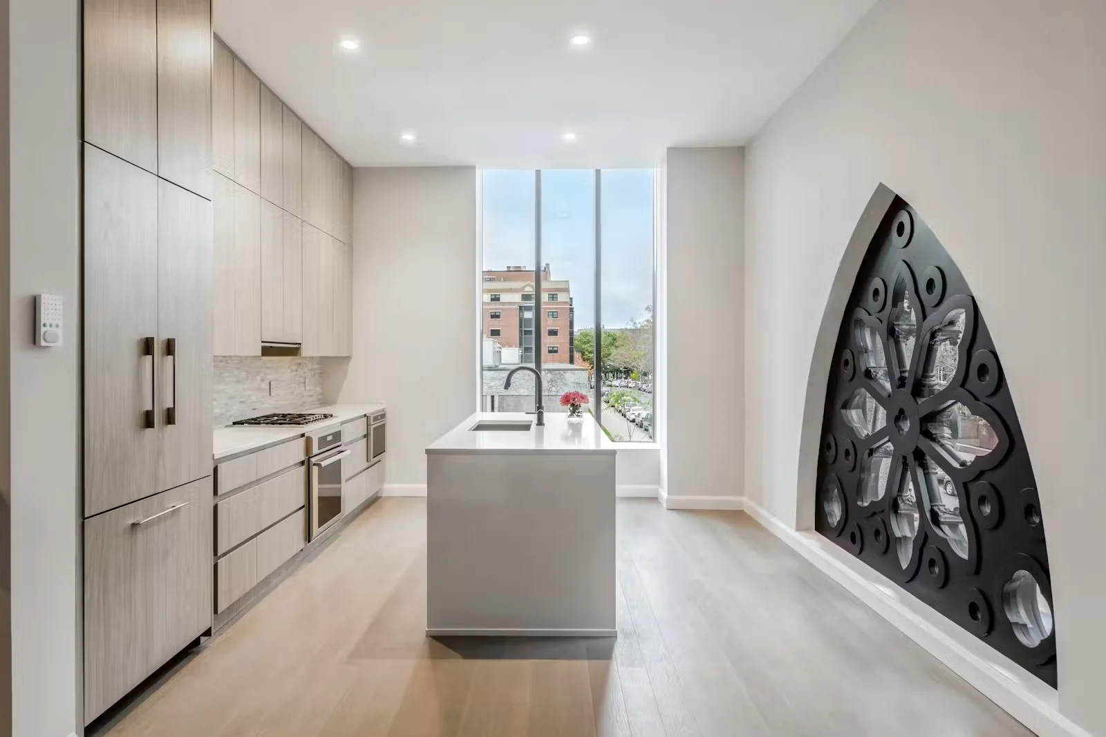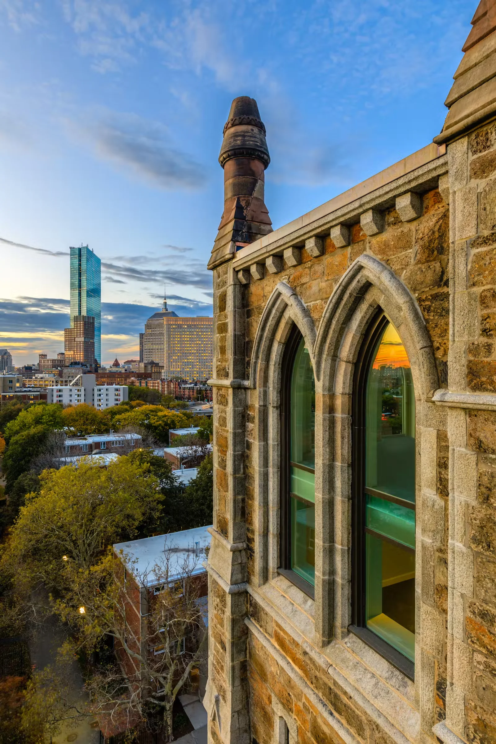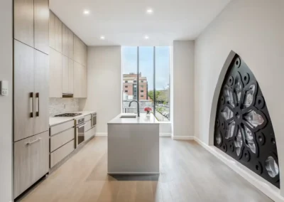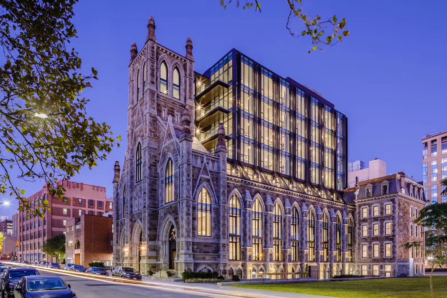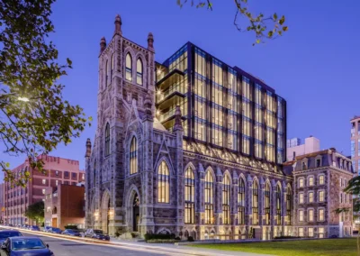 The Lucas in Boston’s South End is a striking adaptive-reuse project where the shell of the 1874 Gothic stone church (German Trinity Catholic Church) was preserved and re-imagined by architect Finegold Alexander Architects into an eight-storey luxury condominium development comprising 33 residences. The design retained the massive granite and pudding-stone exterior walls and major Gothic openings, while a modern steel-and-glass volume was inserted within and above the historic shell, creating a bold dialogue between old and new. The result is a successful merging of heritage architecture with high-end residential living, ensuring the landmark building remains both relevant and preserved for the future.