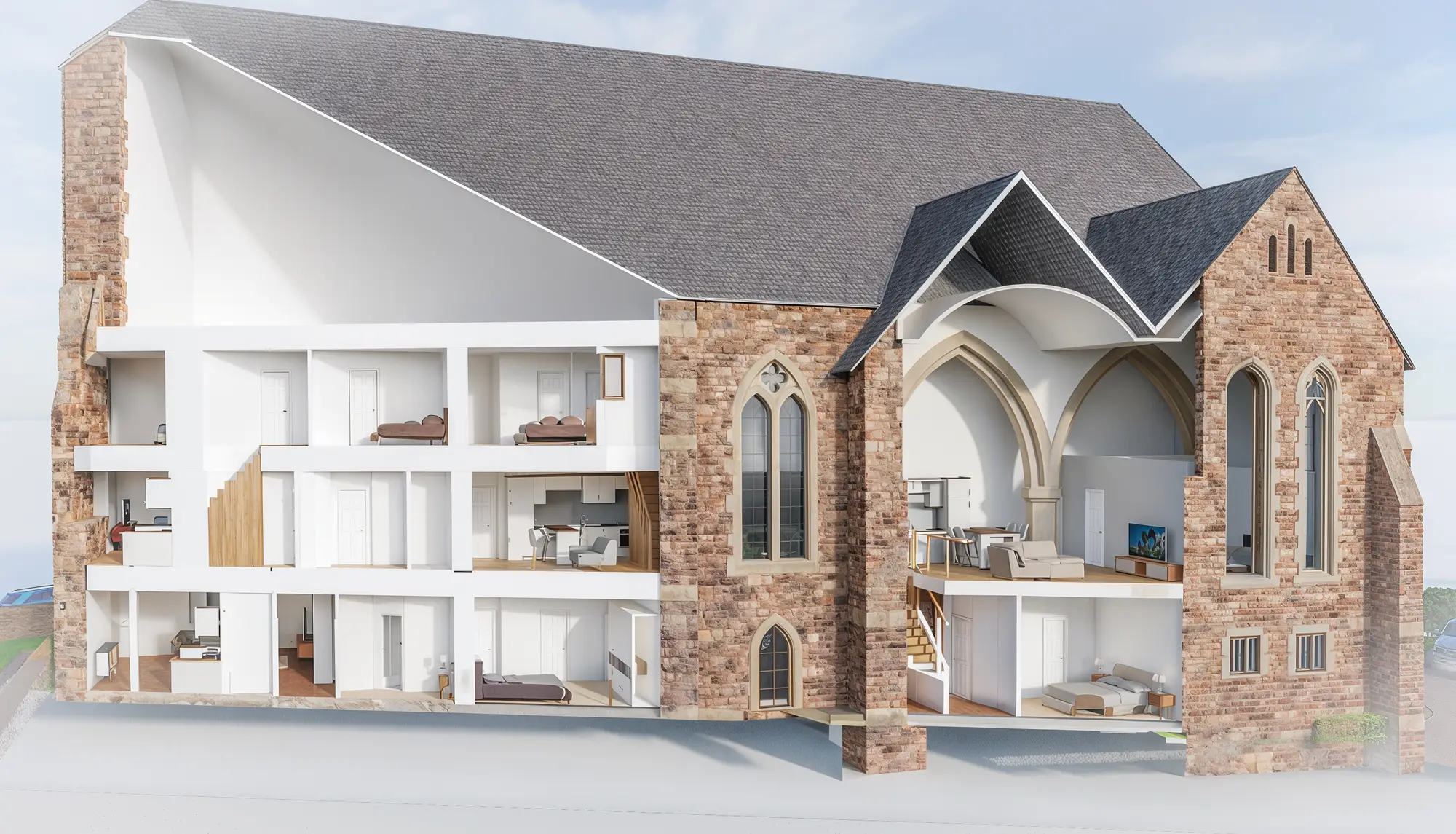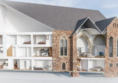 By 2020, the Diocese broadened its marketing efforts, appointing national agent Alder King alongside their local representatives. This approach attracted a number of enquiries, all of which focused on residential conversion. Among these was Czero Developments, the developer of which Church Converts is part, whose track record in adapting historic buildings, including churches, made them a credible partner. With the building no longer viable for worship and community uses proving unsustainable, residential conversion emerged as the most realistic solution. The proposals are rooted in the ‘Principles of Conservation,’ ensuring that the church is not only safeguarded from demolition but that its structure, architectural significance, and historic integrity are preserved as faithfully as possible, even as the building is given a new chapter of life.